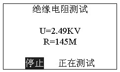 此時(shí)按確認(rèn)鍵(ENTER)進(jìn)入“正在測試”,顯示測試電壓和電阻值。