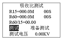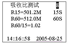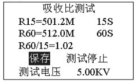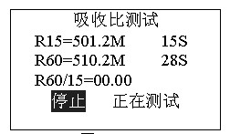 正在測試,若想停止測試,按確認(rèn)鍵停止測試。吸收比測試完畢后自動(dòng)計(jì)算比值,進(jìn)入是否保存提示。