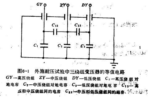 變壓器一般由兩個(gè)以上的繞組組成,每個(gè)繞組對(duì)地都有絕緣,相鄰的兩個(gè)繞組也有絕緣,這樣就可以將每個(gè)繞組看成是電容器的一個(gè)極板,接地部分看成電容器的另一個(gè)極板。一臺(tái)三繞組變壓器的等值電路,如圖6-1所示。