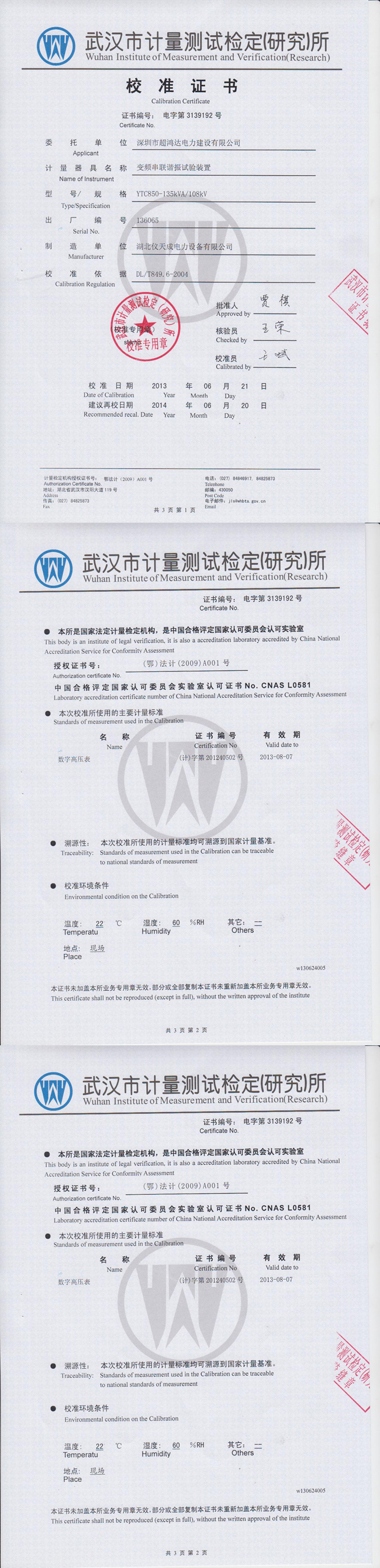 轉(zhuǎn)載:"YTC850系列變頻串聯(lián)諧振試驗裝置資質(zhì)證書" 請注明來源于儀天成電力。 更多技術(shù)問題請致電儀天成電力客戶服務(wù):027-87876585,技術(shù)部專線:027-87876585,在線客服:719388481